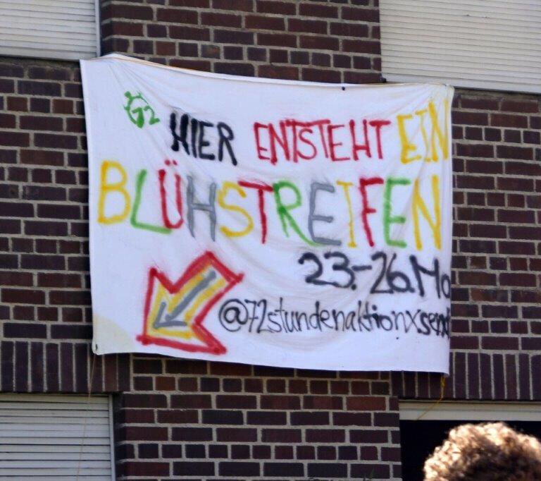 Beschreibung: Die Baumaßnahmen des Mittleren Rings haben ihre Schotter-Spuren hinterlassen. Zumindest auf dem Pfarreigelände zwischen dem neu angelegten Fahrradeweg und dem Kirchhof! Schön ist was anderes. Da muss was Grünes her! Die 72 Stunden Aktion wird von den Jugendlichen in XY genutzt um einen Blühstreifen anzulegen. Und damit nicht genug. Innerhalb der 3 Tage wird auch noch ein Übergang zwischen dem öffentlichem Gehweg und dem Kirchhof angelegt, Schilder gebastelt und Begrenzungen eingerichtet.