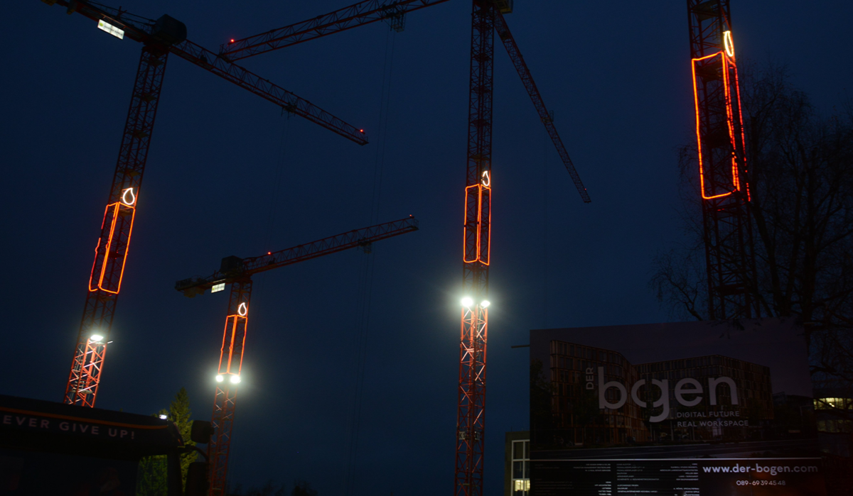 Die Baustelle des neuen Business-Campus „DER bogen“ bringt ab sofort Weihnachtsstimmung in den Münchner Bezirk Bogenhausen. Dort wird in den kommenden Wochen Münchens wohl größter Adventskranz entstehen. Dafür werden auf vier der insgesamt fünf Baustellenkräne rund 10 Meter hohe LED-Kerzen erstrahlen.