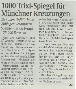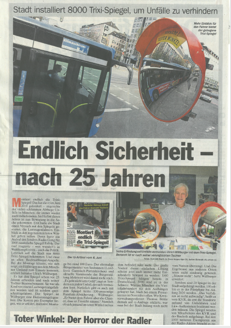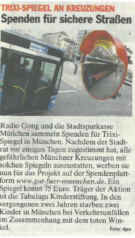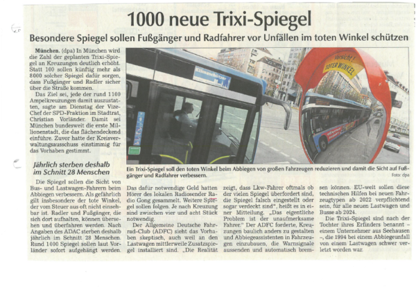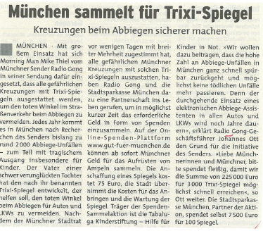 Jedes Jahr passieren 2.000 Abbiege-Unfälle bei uns in München. Als es erneut zu einem schweren Unfall an der Reichenbachbrücke kommt, greift Gong 96.3 das Thema auf und beleuchtet es in vielen Facetten. Unter anderem sprechen wir mir Ullrich Willburger. Auch seine Tochter Beatrix wurde bei so einem Abbiege-Unfall schwer verletzt. Am Krankenbett verspricht er ihr etwas zu erfinden, das solche Unfälle verhindert. Er erfindet den sogenannten „Trixi-Spiegel“. Dieser kleine Spiegel macht den toten Winkel für Auto- und LKW-Fahrer an Ampeln sichtbar. Nur 75 Euro kostet so ein Spiegel in der Herstellung – doch die Kommunen geben dafür kein Geld aus.