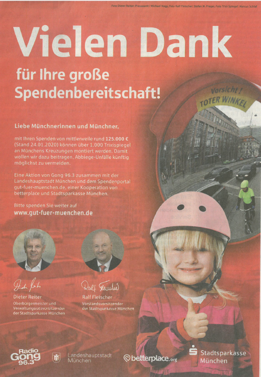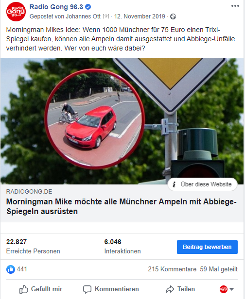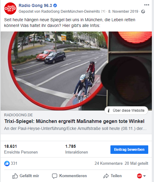Deshalb nimmt Gong 96.3 Moderator Mike Thiel die Sache in die Hand. Er will gemeinsam mit den Hörern alle Ampeln in München mit den Spiegeln ausstatten. Die Crowdfunding Aktion im Radio wird ein voller Erfolg. Schulen, Firmen und Familien: Alle machen mit und übernehmen Patenschaften für Spiegel. Rund 125.000 Euro kommen in kurzer Zeit zusammen und auch der Münchner Stadtrat stimmt aufgrund dieser enormen Welle, die Gong 96.3 ausgelöst hat, für die Anbringung der Spiegel. Die ersten der 1.000 Spiegel hängen bereits – in den nächsten Monaten werden dann alle Gefahren-Ampeln in München mit einem Spiegel ausgerüstet sein. Die Aktion zeigt wie Radio nachhaltig Dinge gemeinsam mit den Hörern verändern kann und dabei „in aller Munde“ ist.