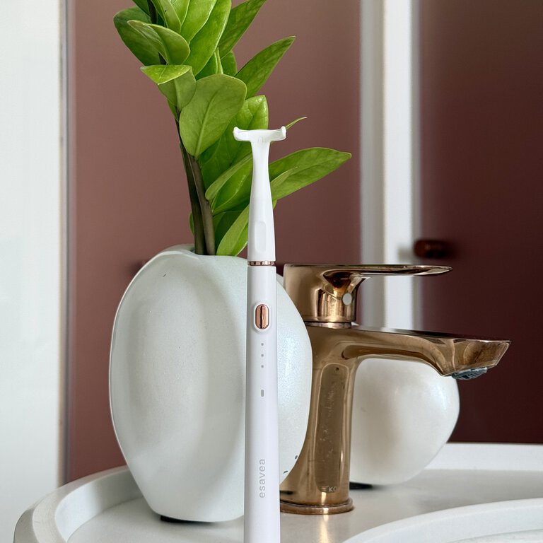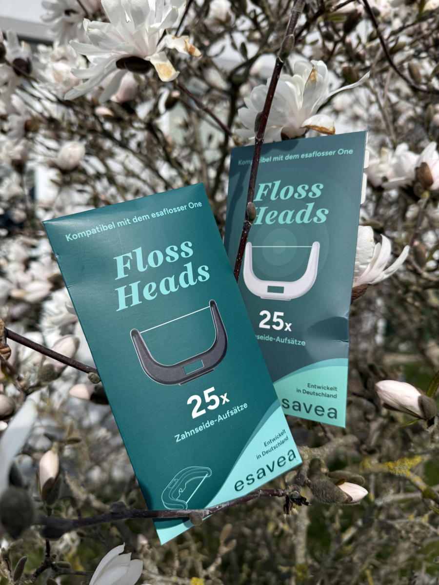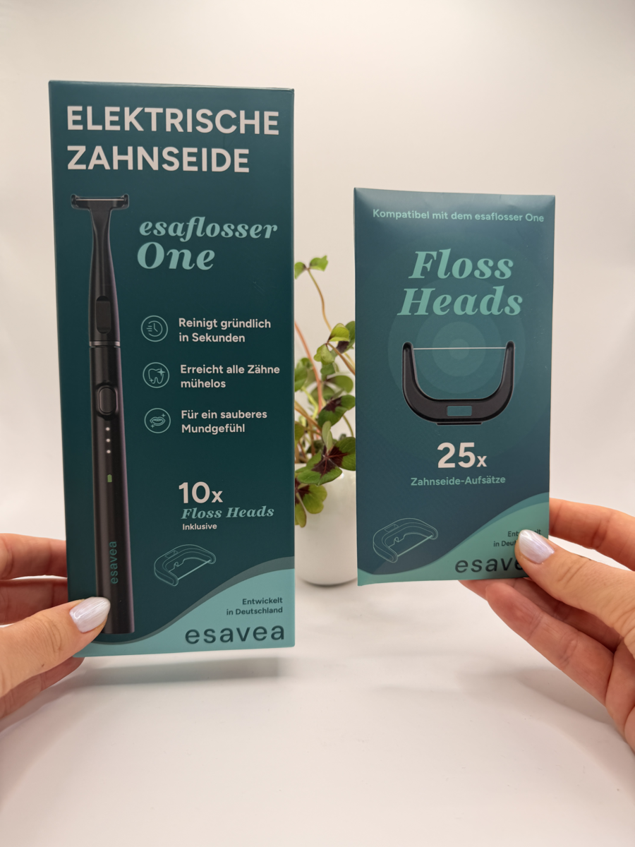 Der esaflosser von esavea ist eine elektrische Zahnseide mit Akku. Vorne ist ein Zahnseide-Aufsatz eingespannt, der beim Einschalten stark vibriert und so Plaque und Essensreste aus den Zahnzwischenräumen löst – also genau da, wo die Zahnbürste nicht hinkommt. Viel einfacher und schneller als normale Zahnseide, kein Gefummel mit den Fingern. Der Akku wird per USB geladen, sodass man das Gerät kabellos benutzen kann.
