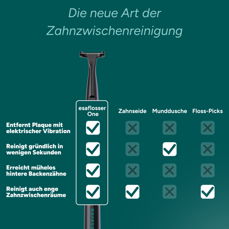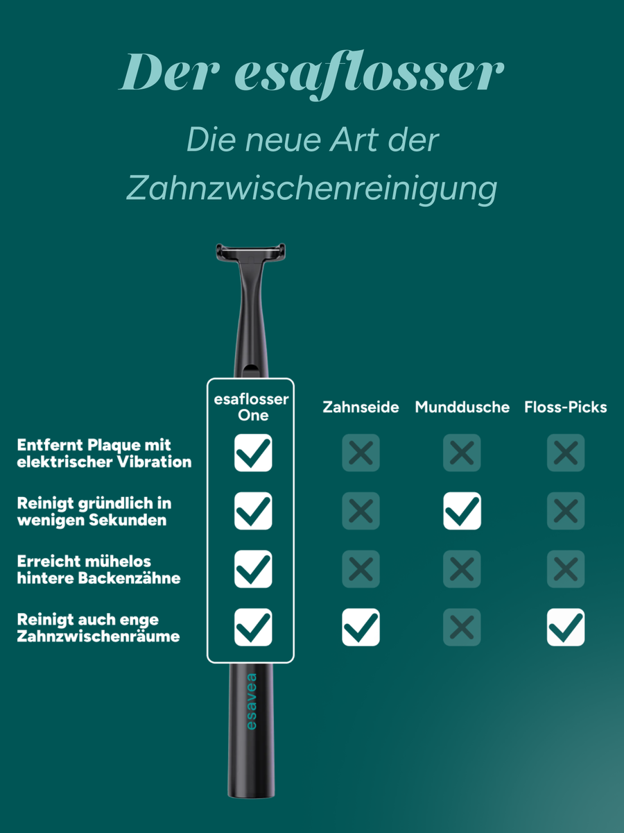 Das Geniale ist, dass wir nicht die Zahnpflege neu erfinden, sondern sie endlich praktikabel machen. Millionen Menschen wissen, dass Zahnseide wichtig ist nutzen sie aber trotzdem nicht. Wir machen daraus eine einfache, schnelle Routine, die wirklich im Alltag ankommt.Mit dem esaflosser erreicht man auch die hinteren Backenzähne problemlos und entfernt durch Vibration Plaque besonders effektiv. Ohne Wasser, ohne Gefummel dafür so intuitiv wie Zähneputzen. Wir sorgen dafür, dass Menschen endlich täglich Zahnseide benutzen.