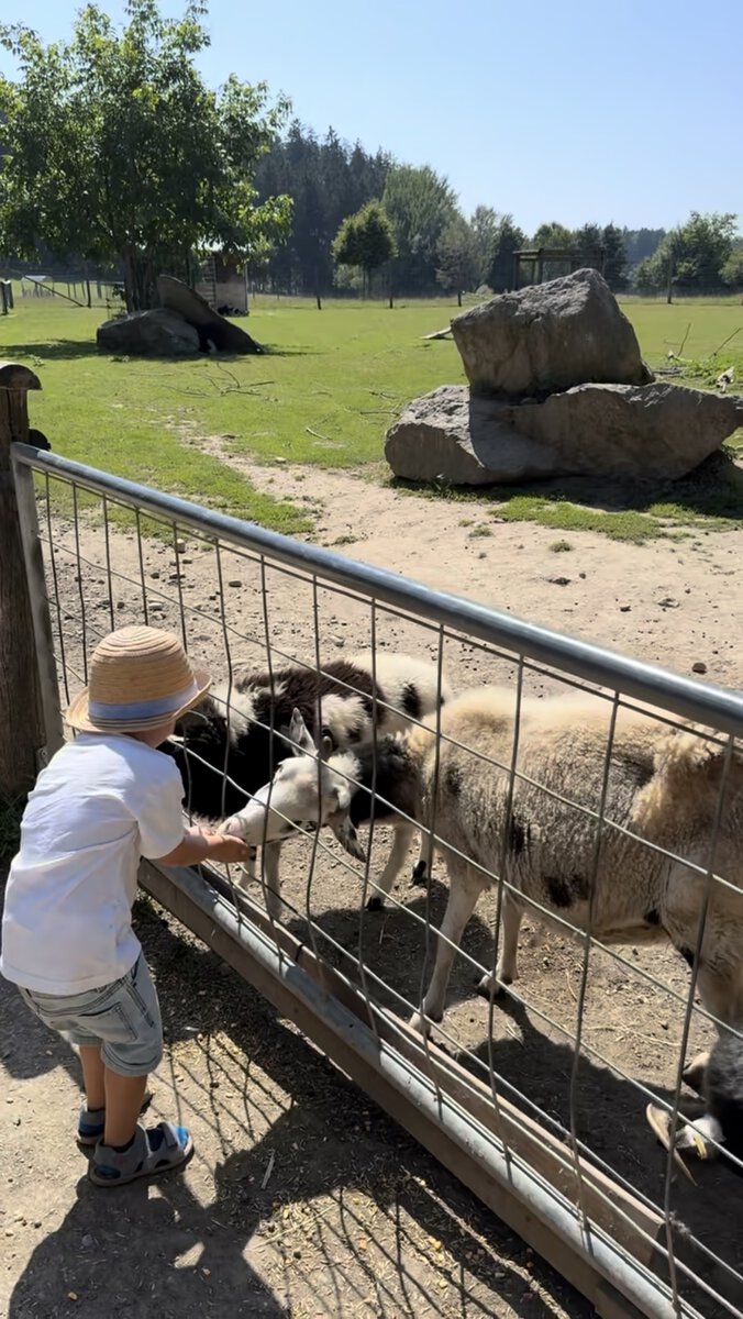 An den Tiergehegen und Spielplätzen vorbei, findet sich weiter hinten ein Waldrundweg. Der ist mit Kinderwagen/Bollerwagen machbar, aufgrund der Steigung des Hügels nicht ohne. Wir haben den Kinderwagen stehen gelassen und sind mit den Jungs gegangen. Der Waldrundweg ist auch für unseren fast 3 jährigen zu laufen und bietet jede Menge Stationen für die Kids – schattig, ruhig und überall gab’s was zu entdecken. Außerdem könnt ihr mit dem dort gekauften Futter Ziegen, Hirsche, Ponys, Alpakas & Co. füttern und dabei ganz nah erleben.