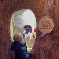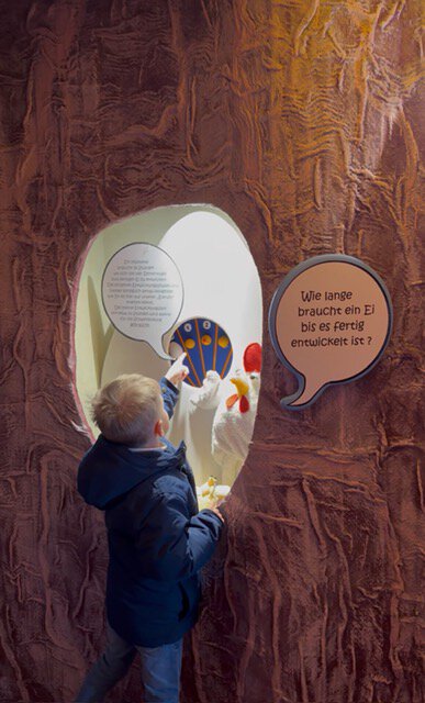 Außerdem könnt ihr in ein riesiges Huhn rein laufen und selbst mit erleben, wie ein Ei im Inneren eines Huhns entsteht.