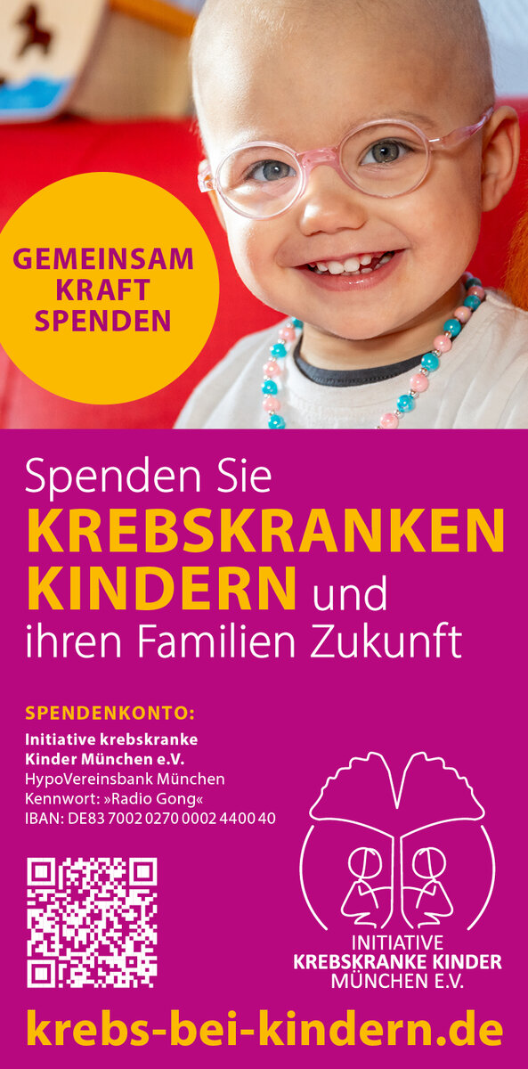 Seit 1985 unterstützt die ‚Initiative krebskranke Kinder München e.V.‘ krebskranke Kinder und ihre Angehörigen durch viele Hilfsangebote, die Mut machen, Kraft und Perspektiven geben: finanzielle Soforthilfe, Bezahlung von Personal, Bereitstellung von Elternwohnungen in Kliniknähe, Ausstattung der Kinderkrebsstation, Therapieangebote und umfangreiche Nachsorge-Aktivitäten, um die Krankheit zu verarbeiten und einen neuen Alltag zu finden, und vieles mehr. All diese Maßnahmen sichern die Versorgung der Kinder und erhöhen die Lebensqualität der Familien.