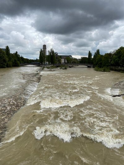 Das Wasser scheint grünlicher und nicht mehr blau und die Ufer sind teilweise schon überflutet. Grund ist der viele Regen der letzten Tage, auch in den Alpen. Deshalb hat die Isar seit der vergangenen Nacht (12.05.2023) nun Hochwasser-Meldestufe 1 von 4 erreicht.