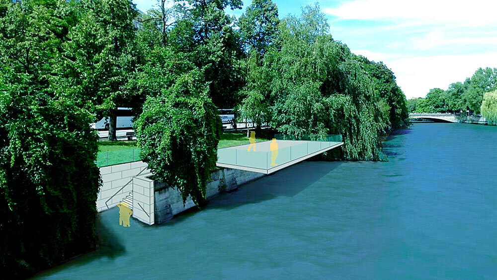 Schon heute planschen viele Menschen in den Isarfluten. Der Gedanke eines Flussbades ist aus dieser Idee heraus geboren. Baden soll dort in einem gesicherten Bereich möglich sein und entsprechende Infrastruktur einen gewissen Komfort bieten. Die Gestaltung der Zugänge ist noch offen, möglich wären Einstiege über Rampen oder Treppen oder die Anbringung einer Plattform über dem Fluss.