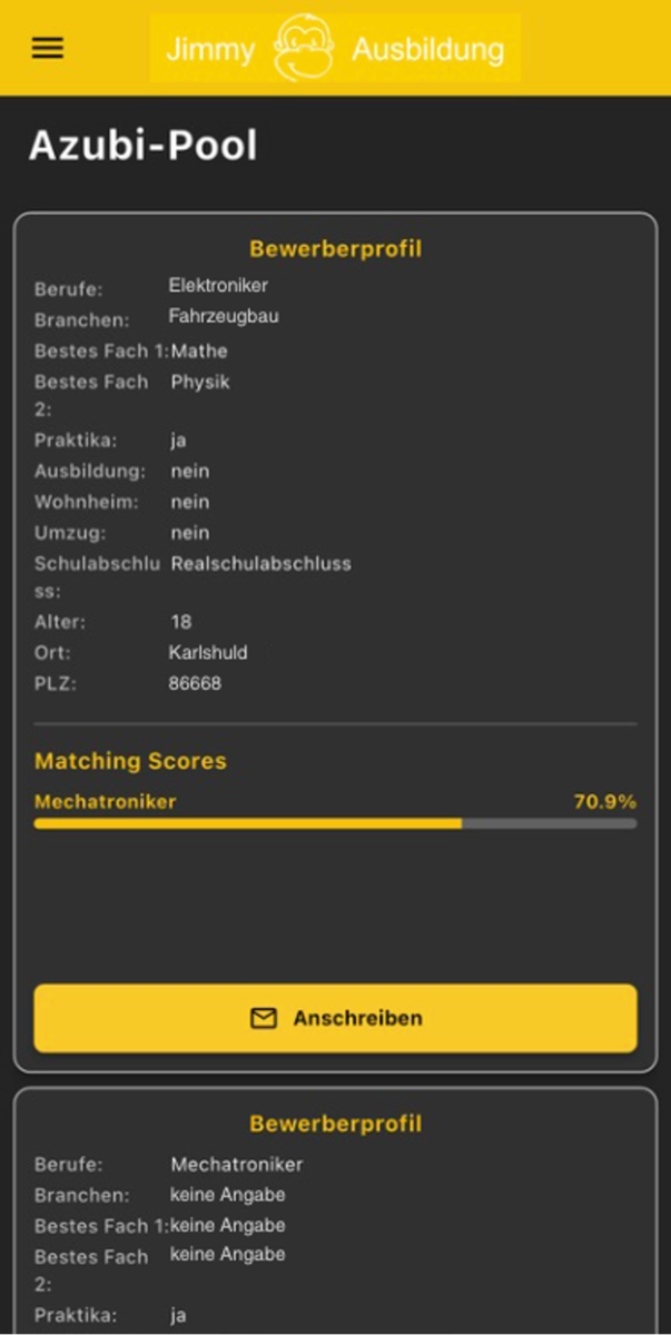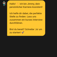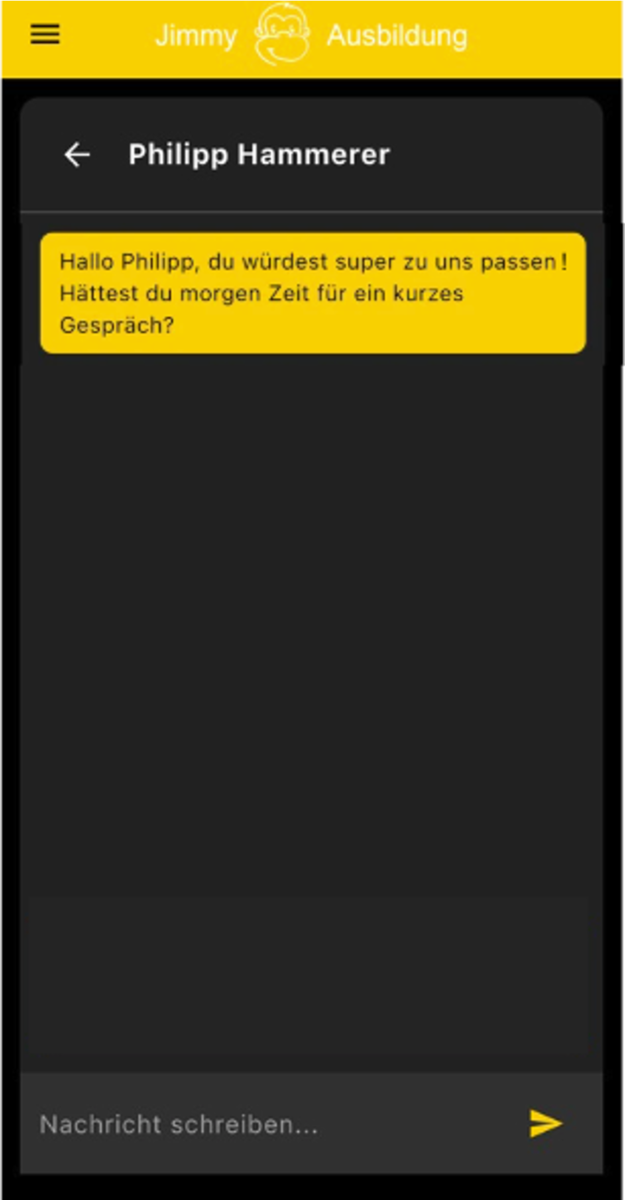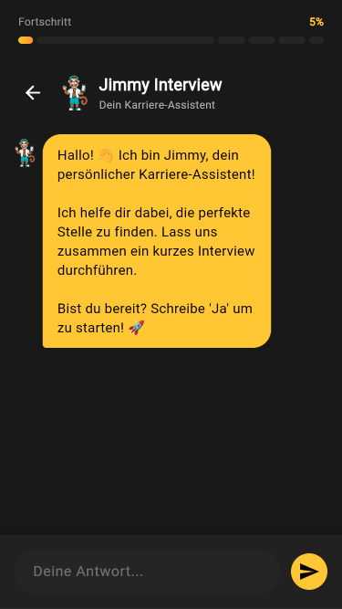 Jimmy Ausbildung dreht den Bewerbungsprozess um, indem Unternehmen aktiv auf Schüler zugehen.Betriebe sehen einen Bewerberpool mit Scores und können interessante Kandidaten direkt über die Plattform kontaktieren, wodurch auch weniger bekannte Ausbildungsberufe mehr Sichtbarkeit bekommen.Für Schüler entfällt das klassische Bewerben komplett, da sie nur ein Jobinterview mit unserem Chatbot Jimmy führen und direkt von Unternehmen angesprochen werden können.