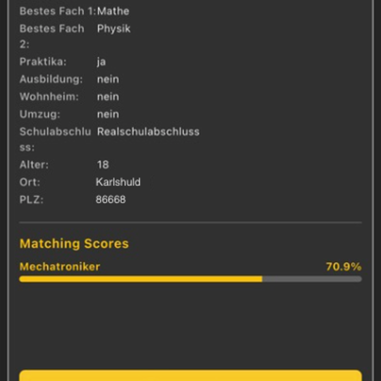 Digitale Plattform, die Schüler und Ausbildungsbetriebe zusammenbringt. Jugendliche beantworten in einem kurzen Chat mit einem Bot Fragen zu Interessen, Stärken und Wünschen – daraus entsteht automatisch ein Profil, ohne Lebenslauf oder Anschreiben. Ein Matching-Algorithmus vergleicht diese Profile mit den Anforderungen von Unternehmen und zeigt passende Kandidaten an. Betriebe können die Jugendlichen dann direkt kontaktieren und zum Gespräch einladen. Ziel ist es, den Einstieg in die Ausbildung deutlich einfacher und schneller zu machen – vor allem für die Generation, die alles übers Smartphone erledigt.