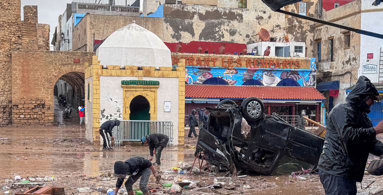 Komplett schwarz gekleidet, schwarze Kopfbedeckung, kräftige Statur