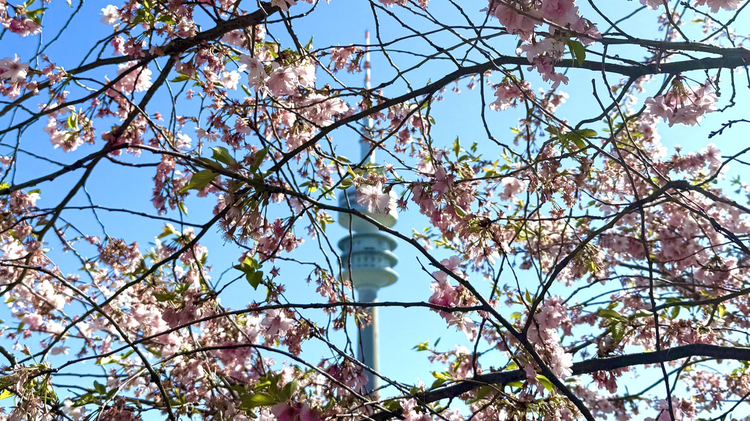 Rosa Blüten, strahlender Sonnenschein und überall gezückte Smartphones: Die Kirschblüte verwandelt München aktuell in eine kleine Frühlingskulisse wie in Japan. Besonders im Olympiapark zieht das Naturschauspiel derzeit zahlreiche Besucher an.