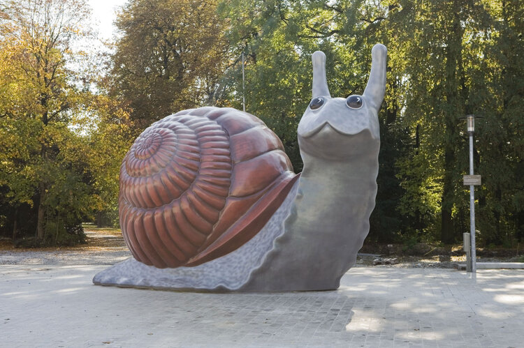 Die Riesen-Schnecke auf dem Platz beim Bavariapark wird wieder verschönert. Heute wird die 4,50 Meter hohe Skulptur unter einem Zelt verschwinden, dann beginnen die Arbeiten. In den kommenden zwei Wochen wird die Schnecke unter anderem neue bemalt.