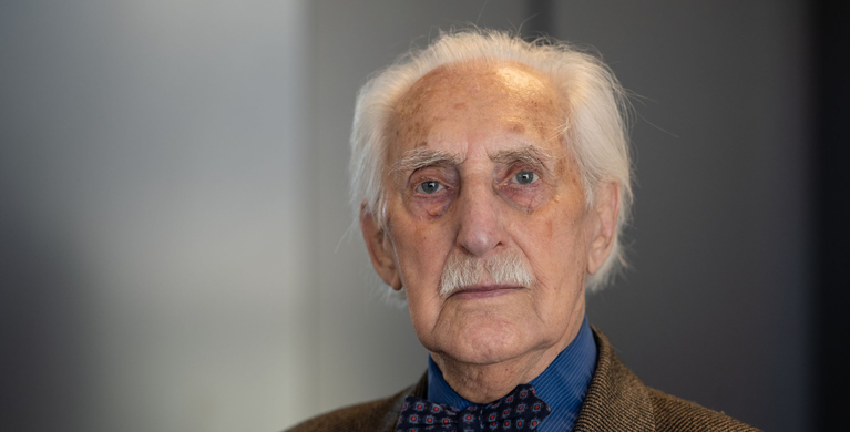 war bekleidet mit einem grauen Hoodie (Kapuzenpulli), blauer