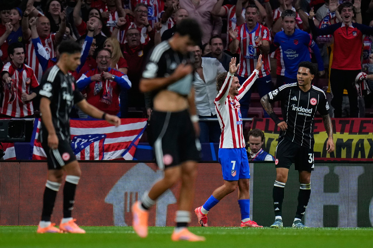 Deftige Pleite statt erneuter Fußball-Party: Eintracht Frankfurt hat das Gastspiel bei Atlético Madrid mit 1:5 (0:3) verloren und nach dem starken Auftakt einen herben Dämpfer in der Champions League kassiert. Giacomo Raspadori in der 4. Minute, Robin Le Normand (33.), Antoine Griezmann (45.+1), Giuliano Simeone (70.) und Julián Alvarez (82./Handelfmeter) erzielten die Tore für die in allen Belangen überlegenen Spanier, die dem Bundesligisten eine Königsklassen-Lektion erteilten.
