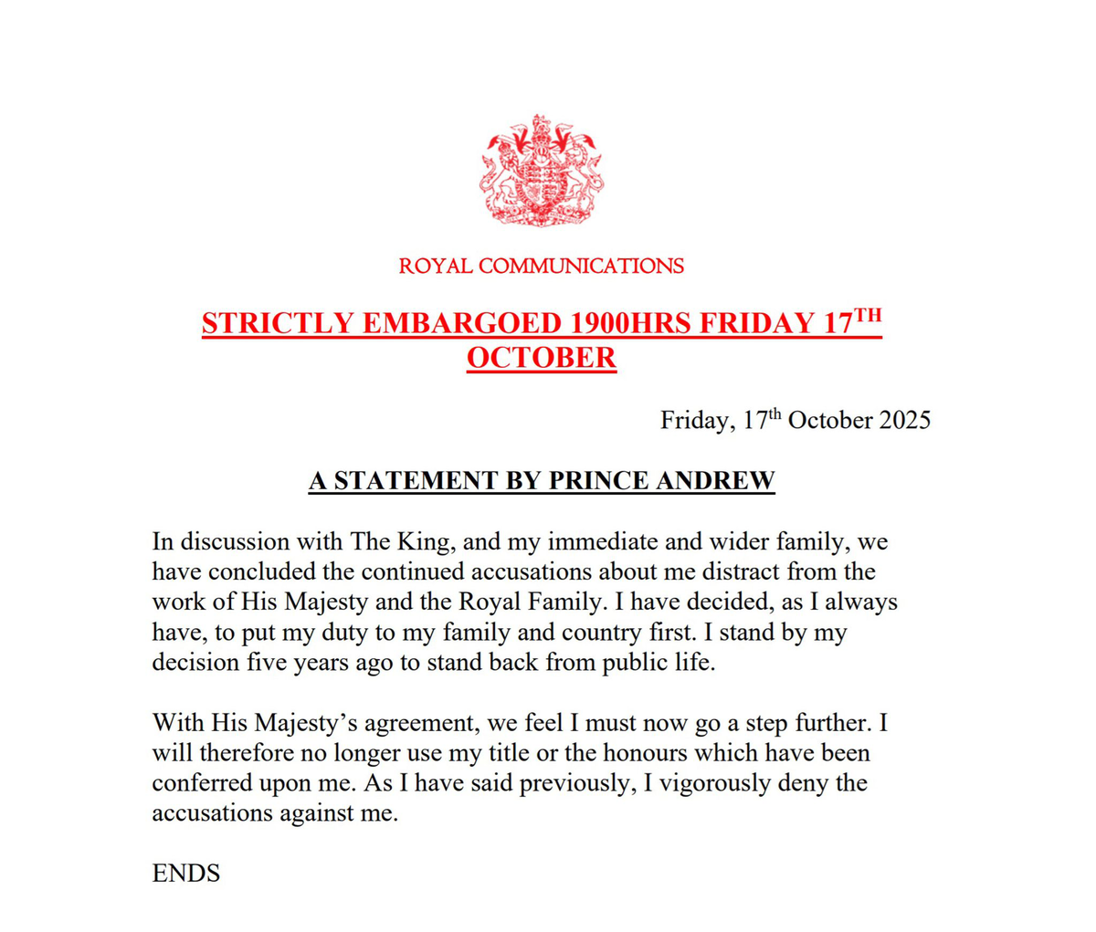 Nach neuen mutmaßlichen Beweisen für die wohl tiefe Freundschaft zwischen Andrew und Epstein und kurz vor der Veröffentlichung der Memoiren des bekanntesten Opfers hat der Prinz am Freitagabend seine verbliebenen Titel und Ehrungen aufgegeben. «Nach Diskussionen» mit dem König und seiner Familie, steht in der offiziellen Mitteilung zwar. Der Tenor diverser britischer Medien ist aber klar: Andrew musste verzichten - sonst hätte der König den Schritt von oberster Stelle aus angeordnet.