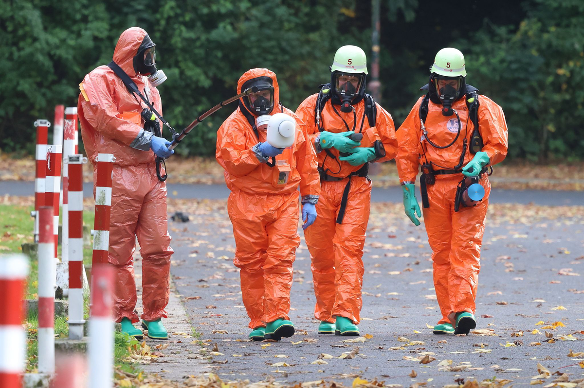 Ein Auto wurde von einem weißen Zelt abgedeckt. In dem Fahrzeug saßen nach Angaben der Feuerwehr zwei zivile Polizeibeamte und eine weitere dritte Person. Keiner der Personen sei kontaminiert gewesen, sagte der Feuerwehrsprecher. Das Fahrzeug fuhr später mit den Insassen ab. Um wen es sich bei der dritten Person handelte, war zunächst unklar.