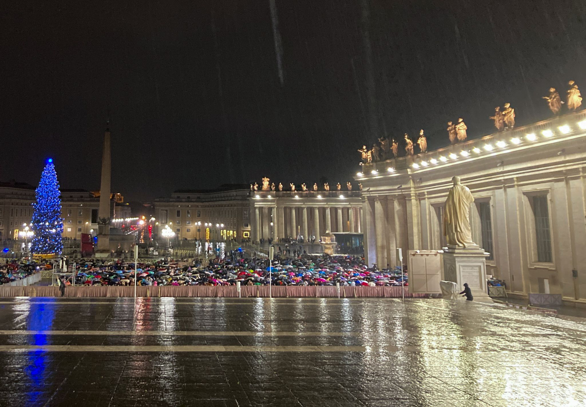 Auf dem Petersplatz verfolgten Tausende bei strömendem Regen die auf Bildschirmen nach draußen übertragene Messe. Der Papst hatte sie vor Beginn begrüßt, ihnen frohe Weihnachten gewünscht und sich bedankt, dass trotz des schlechten Wetters so viele gekommen seien. Der Petersdom sei zwar groß, biete aber nicht genug Platz für alle. Bevor er sich vor der Messe nochmals kurz zurückzog, segnete er die Gläubigen, die unter Regenschirmen ausharrten.