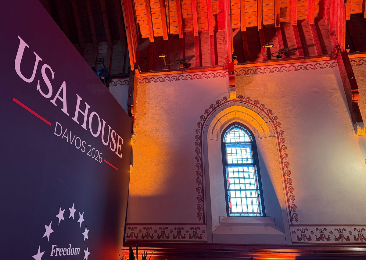 Der Altar ist eine Bühne. Werbetafeln, buntes Licht - und sehr viel Amerika. Vor der Orgelempore künden Banner vom nahenden 250. Jahrestag der Gründung der USA. Zum Weltwirtschaftsforum in Davos hat die US-Delegation eine ganze Kirche als «USA House» geschmückt. Hier wird über Künstliche Intelligenz und Raumfahrt diskutiert, aber auch über Gott. Glaube, Pomp und Pathos eng beieinander: Es wirkt wie ein Sinnbild der Politik von Donald Trump.