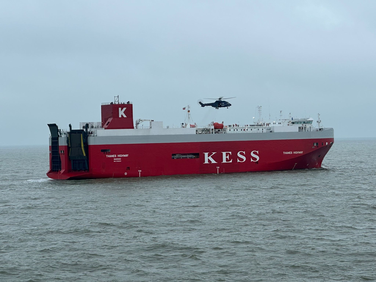 Nach einem Brand ist der manövrierunfähige Autotransporter «MS Thames Highway» auf dem Weg zum Emder Hafen. Das Schiff soll dort abends ankommen, sagte ein Sprecher der Wasserschutzpolizei. Einsatzkräfte löschten die Flammen vollständig, laut Havariekommando wurde niemand verletzt.