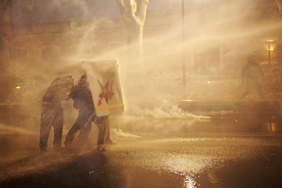 Aus der Menge flogen Steine, Molotowcocktails und andere Gegenstände in Richtung der Polizei. Mehrere Müllcontainer standen in Brand. Auch ein Einsatzwagen brannte. Die Ordnungskräfte setzten Tränengas und Wasserwerfer ein. Ein Demonstrant wurde mit Kopfverletzungen weggebracht. Auf einem Video ist zu sehen, wie ein am Boden liegender Polizist von Vermummten mit Fußtritten traktiert und geschlagen wird. Dabei ist auch ein Hammer im Einsatz.