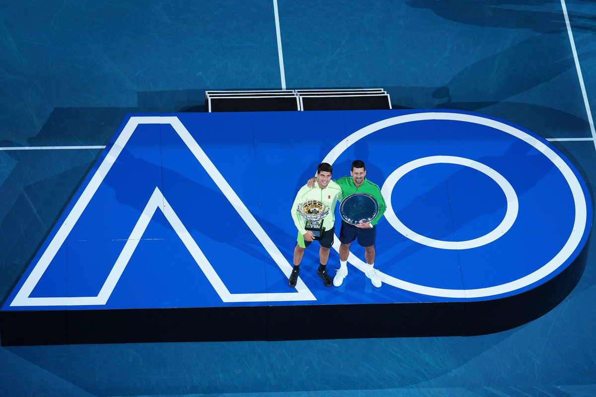 Nachdem er Tennis-Geschichte geschrieben hatte, ließ sich Carlos Alcaraz auf den hellblauen Boden in der Rod Laver Arena fallen. Im Duell der Generationen gewann der Weltranglisten-Erste erstmals den Titel bei den Australian Open und damit als jüngster Spieler der Geschichte bei allen vier Grand-Slam-Turnieren die Trophäe. Im Alter von 22 Jahren und 272 Tagen setzte sich der Spanier in Melbourne im Endspiel gegen den 38 Jahre alten Novak Djokovic mit 2:6, 6:2, 6:3, 7:5 durch.