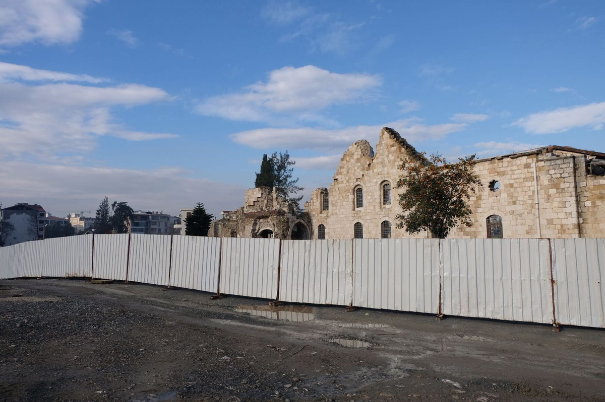 Die Fassade der Kirche ist schon von Weitem zwischen den Trümmern zu sehen. Wie aus Trotz hat die Mauer dem verheerenden Erdbeben vor drei Jahren in der Südosttürkei standgehalten. Während in anderen Stadtteilen schon Neubauten stehen, liegt die Altstadt Antakyas – einst Magnet für Touristen aus aller Welt – noch zum großen Teil in Trümmern.