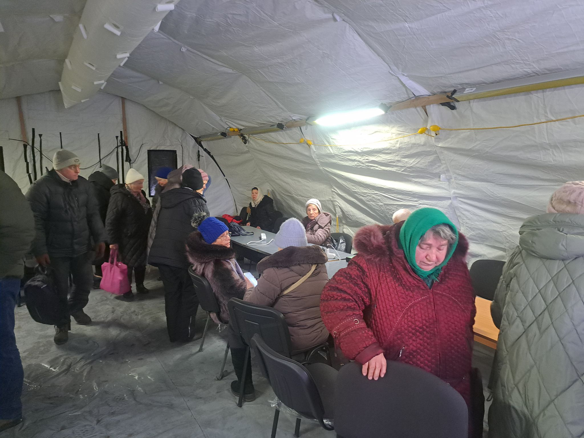 Trojeschtschyna ist einer der ärmsten Stadtteile im Nordosten von Kiew ohne U-Bahnanbindung. Es herrscht wieder Luftalarm. Vor einem Wärmezelt des staatlichen Zivilschutzdienstes stehen knapp zwei Dutzend vor allem ältere Menschen. Sie tragen in die Jahre gekommene Winterkleidung und warten im Schnee auf die Entwarnungsmeldung. Während des Alarms dürfen sie sich nicht im Zelt aufhalten. Auf einem Lastwagen ist ein riesiger Generator montiert. Ratternd liefert er Strom für die Zelte und deren Heizlüfter.