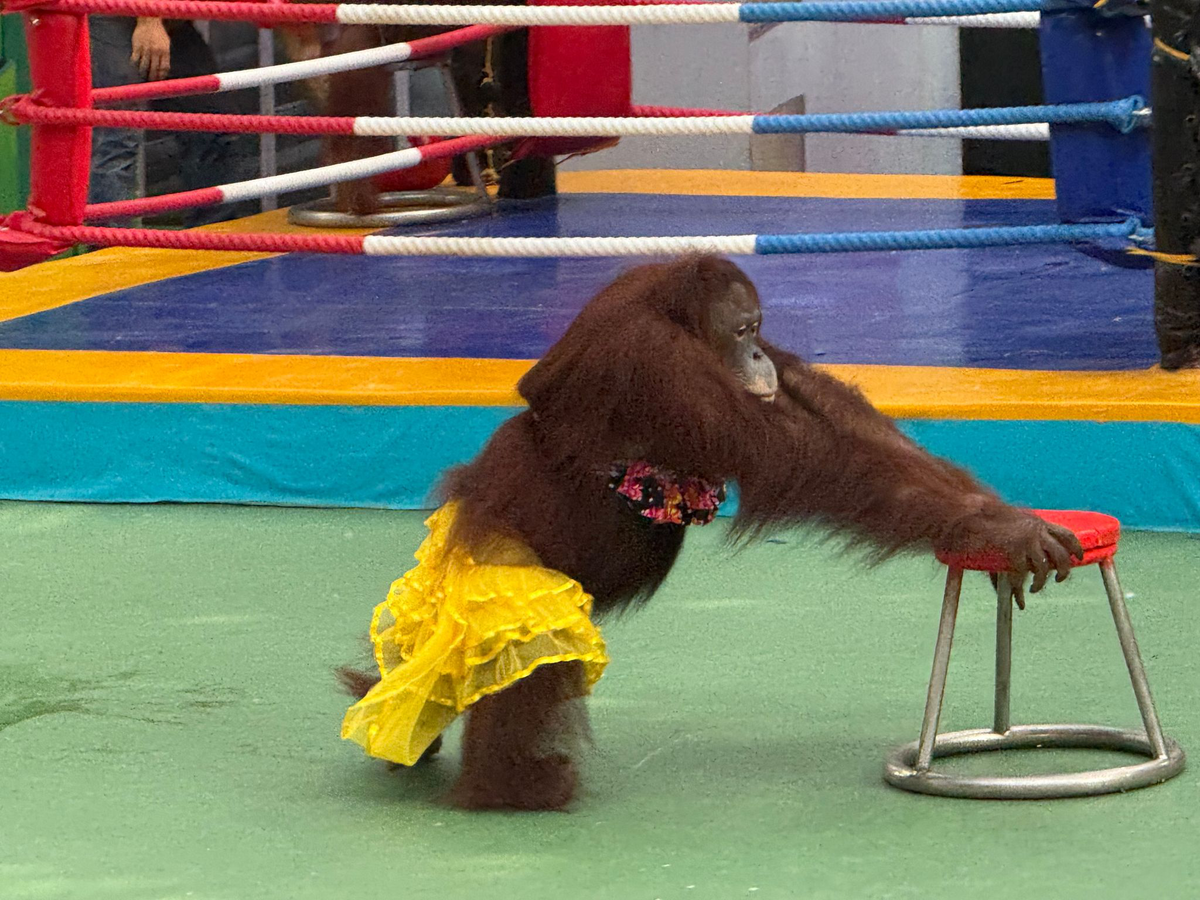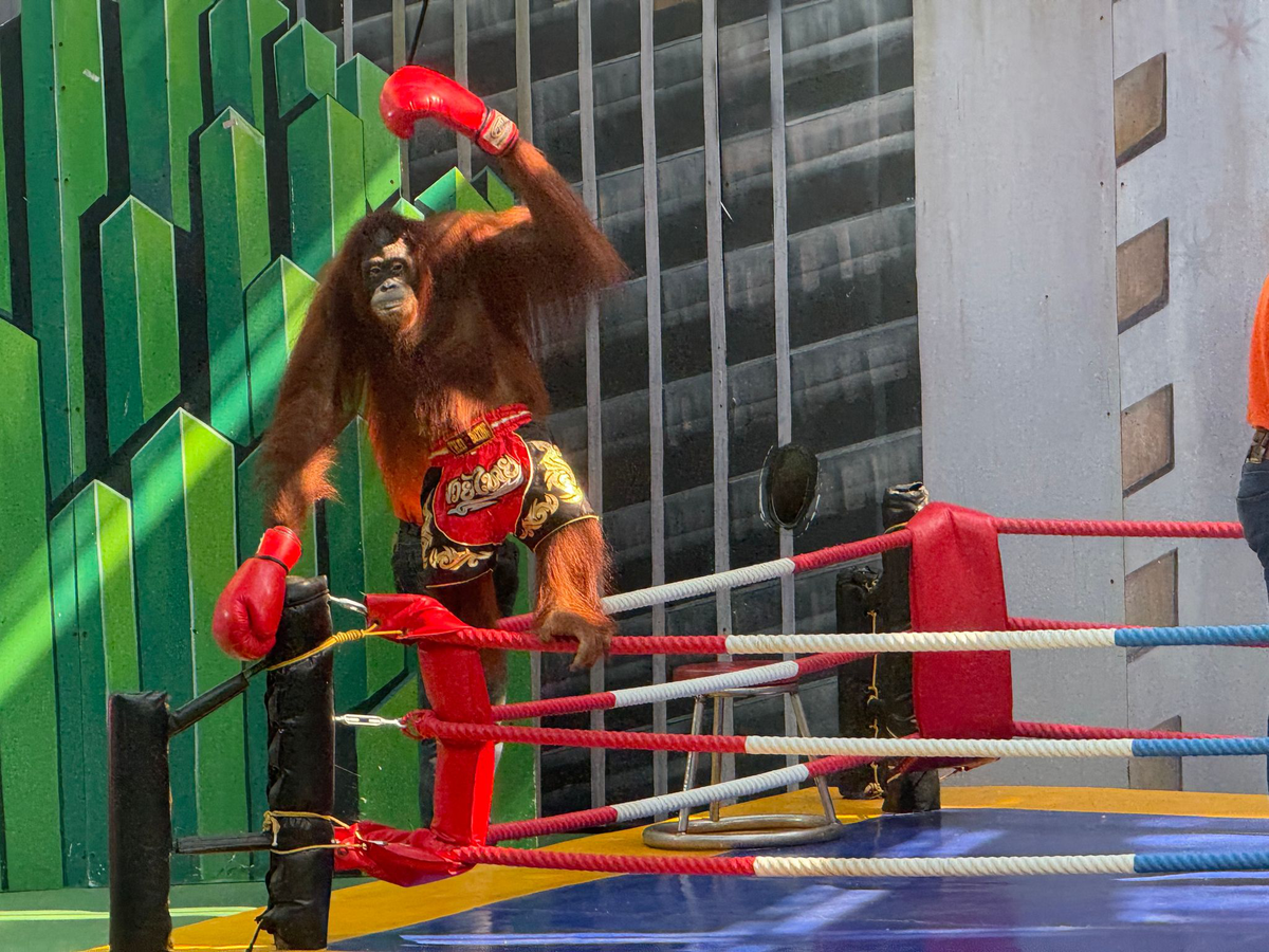 Zwei Orang-Utans tapsen in engen Sporthosen und Boxhandschuhen in den Ring, angefeuert von Animateuren. Die Menschenaffen schlagen einstudierte Haken, werfen sich theatralisch zu Boden. Schließlich reißt der vermeintliche Sieger die Arme in die Höhe. Aber Sieger sind hier nur die Betreiber, bei denen jeden Tag die Kasse klingelt.