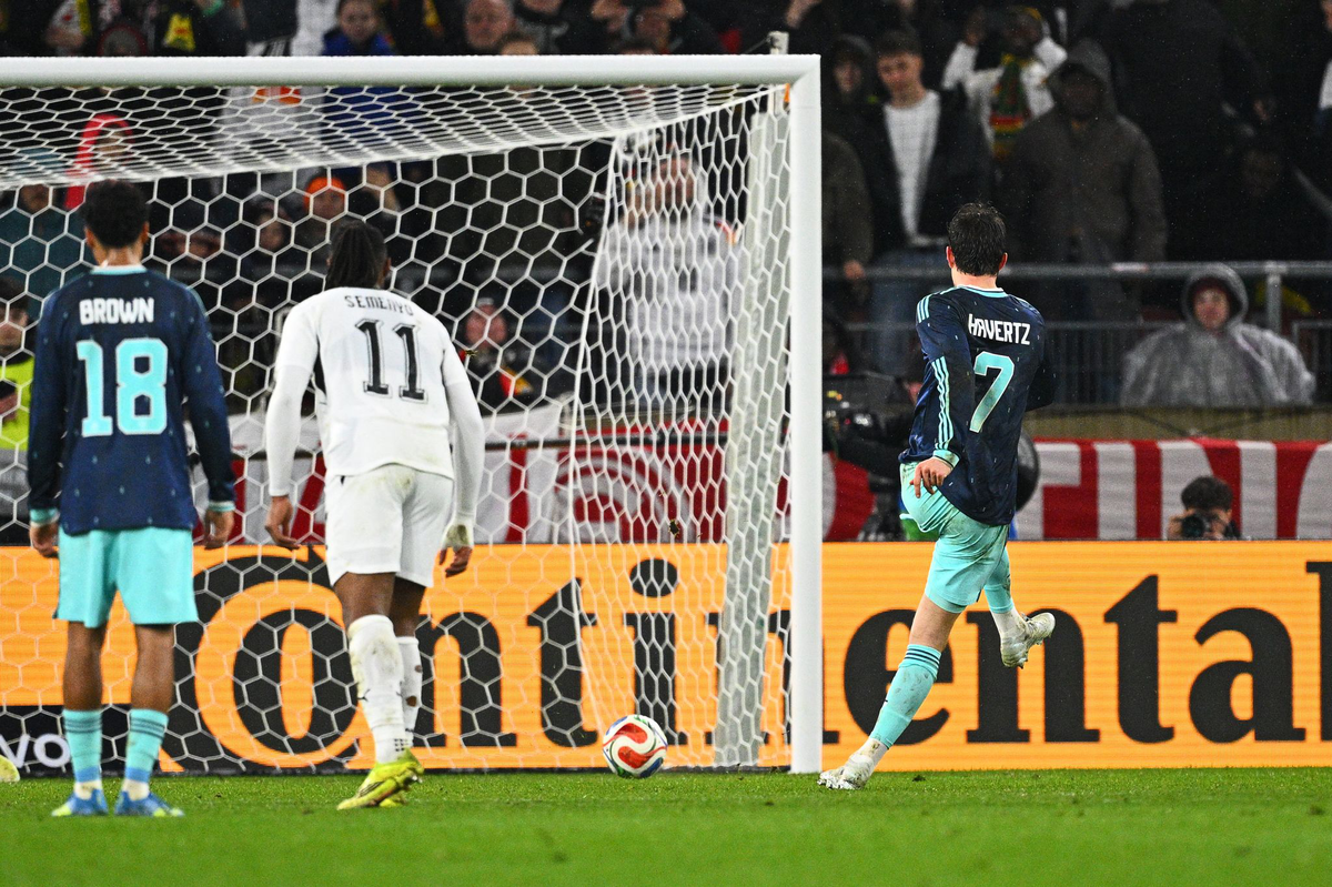 Als Wirtz kurz darauf eine schöne Kombination erfolgreich vollendete, zählte der Treffer nicht, weil Woltemade bei seiner Ablage knapp im Abseits stand. Der Video-Assistent griff auch ein, als Angelo Stiller bei seinem Schuss den abgespreizten Arm des für den VfL Wolfsburg spielenden Verteidigers Jonas Adjetey traf. Nachträglich gab es Elfmeter, Havertz trat an und traf.