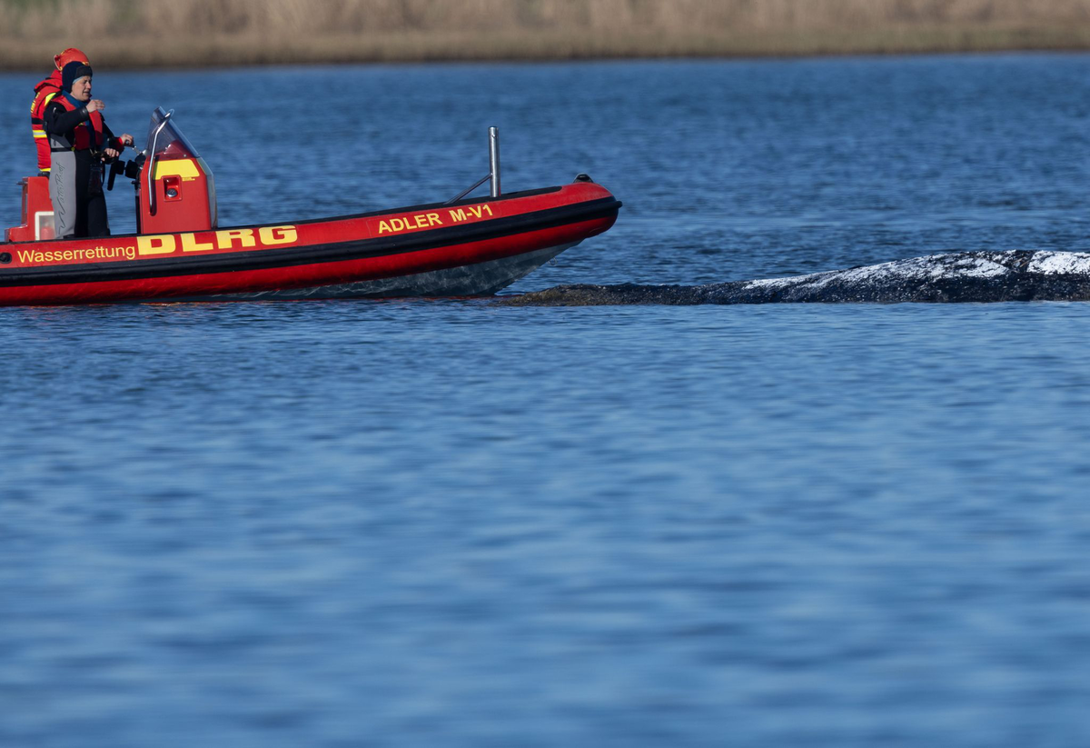 Nach drei Wochen an derselben Stelle war der Wal am Montagmorgen bei steigendem Wasserstand plötzlich losgeschwommen. Von Booten aus versuchten Helfer, ihn Richtung Ostsee zu treiben. Nach zwei Stunden stoppte das vermutlich erschöpfte Tier aber am Übergang der Bucht namens Kirchsee in die Wismarbucht, wo deutlich tieferes Fahrwasser Richtung Ostsee führt.