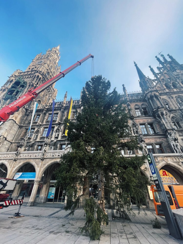 Der diesjährige Weihnachtsbaum kommt aus Ellmau in Tirol. In den kommenden Tagen wird er mit rund 3.000 Lichtern geschmückt – rechtzeitig, bevor der Christkindlmarkt auf dem Marienplatz dann am 24. November 2025 eröffnet.