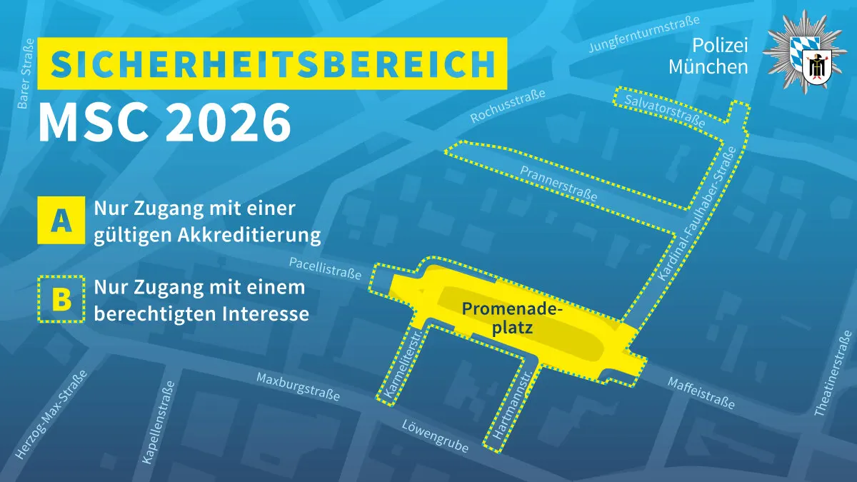 Rund um die beiden Tagungshotels Bayerischer Hof und Rosewood wird zur Münchner Sicherheitskonferenz ein besonderer Sicherheitsbereich eingerichtet, der zeitweise nur mit Akkreditierung oder berechtigtem Interesse betreten werden darf. Zusätzlich sind für das Wochenende mehrere Demonstrationen und Kundgebungen angekündigt, die insbesondere am Samstag zu weiteren Einschränkungen und kurzfristigen Sperrungen in der Münchner Innenstadt führen können.